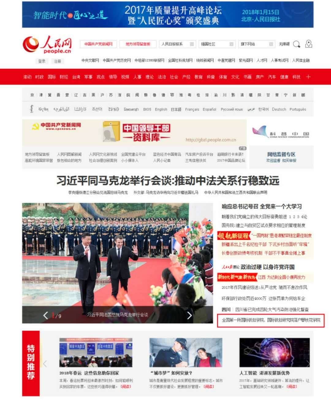 1月10日上午,人民网首页以《全国第一所国际钒钛学院、国际钒钛研究院落户攀枝花学院》为题报道攀枝花国际钒钛学院、攀枝花国际钒钛研究院成立。