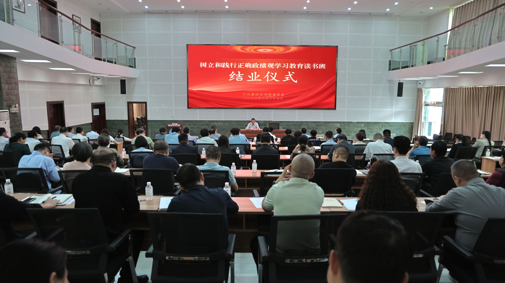 3月27日下午,我校在博雅厅举行树立和践行正确政绩观学习教育读书班结业仪式。校领导、全体中层干部参加会议。党委书记胥刚主持会议并讲话。